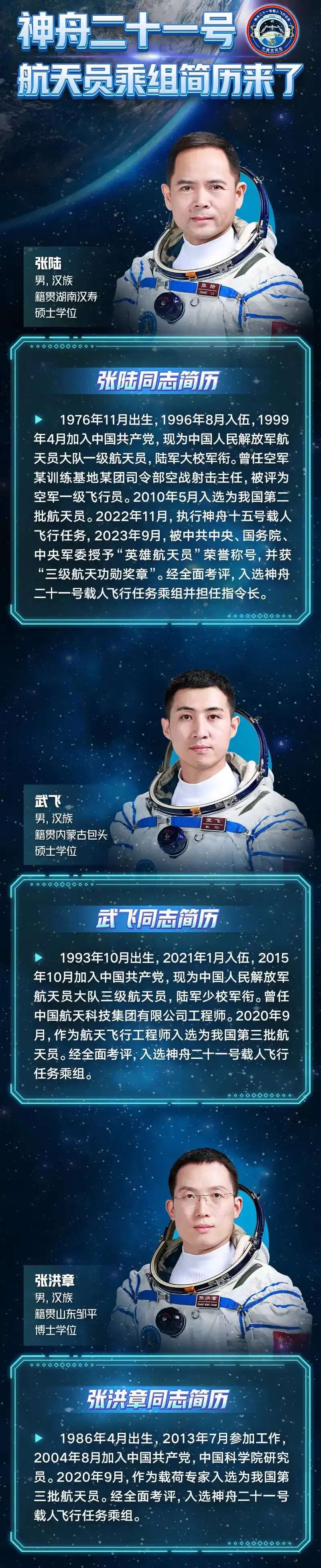 发言人介绍,经任务总指挥部研究决定,瞄准北京时间10月31日23时44分发射神舟二十一号载人飞船。飞行乘组由张陆、武飞、张洪章组成,张陆担任指令长,3名航天员分别为航天驾驶员、飞行工程师和载荷专家,涵盖了我国现役3种航天员类型。
