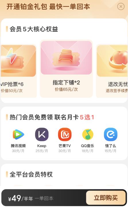 下意识地进行比较,相当多的消费者都会点击第一行的188元按钮进行预订,却忽略了价格右上角的几个小字“+¥49/半年”。