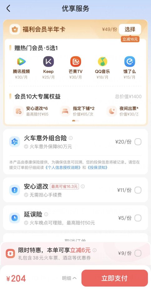 假如消费者都未选择以上引导付费项目,就会来到最终支付页面。在这一页面,“智行火车票”APP又罗列出“福利会员半年卡,49元”“火车组合意外险,20元”“安心退改,11元”“延误险,5元”“限时特惠优惠券,9元”等“优享服务”项目。