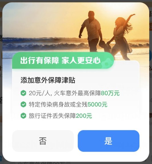 若消费者还是未选择以上引导付费项目,APP跳转支付时会首先弹出“意外保障津贴”提示框。若下意识选择颜色鲜艳的“是”选项,则会收取20元的保险费用;点击灰色的“否”选项,才能够顺利按照原价进行支付购票。