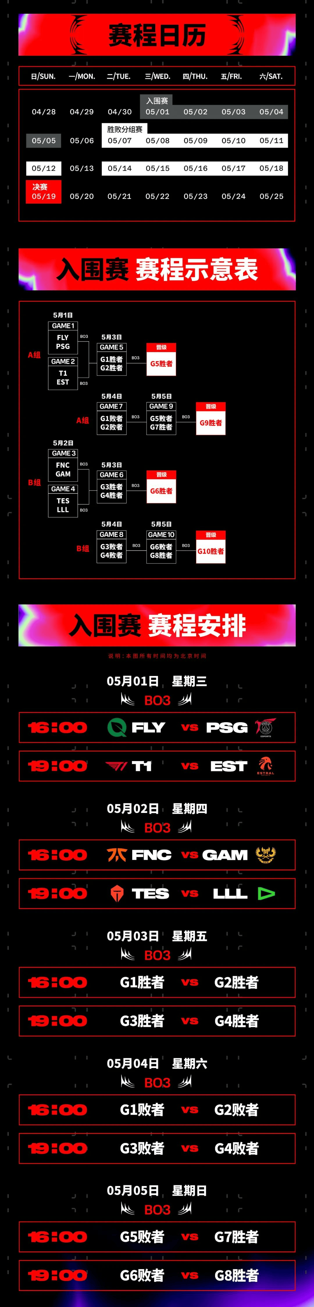 季中冠军赛分为两个阶段:入围赛(5月1-5日)和胜败分组赛(5月7-12日,14-19日)。