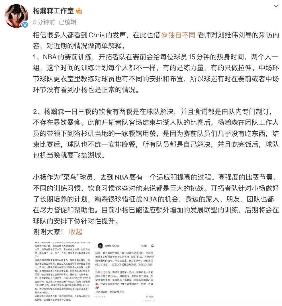 11月5日,杨瀚森工作室通过白鹿视频发布声明,回应了近期有关杨瀚森的争议。声明中指出: