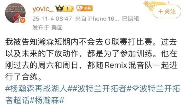 开拓者将继续开始连续的客场比赛,而其下属的G联赛球队“撕裂之城混音队”也从7日开始了比赛。因此,开拓者此次客场之旅中带上了杨瀚森,这意味着他在近期将不会前往发展联盟比赛。