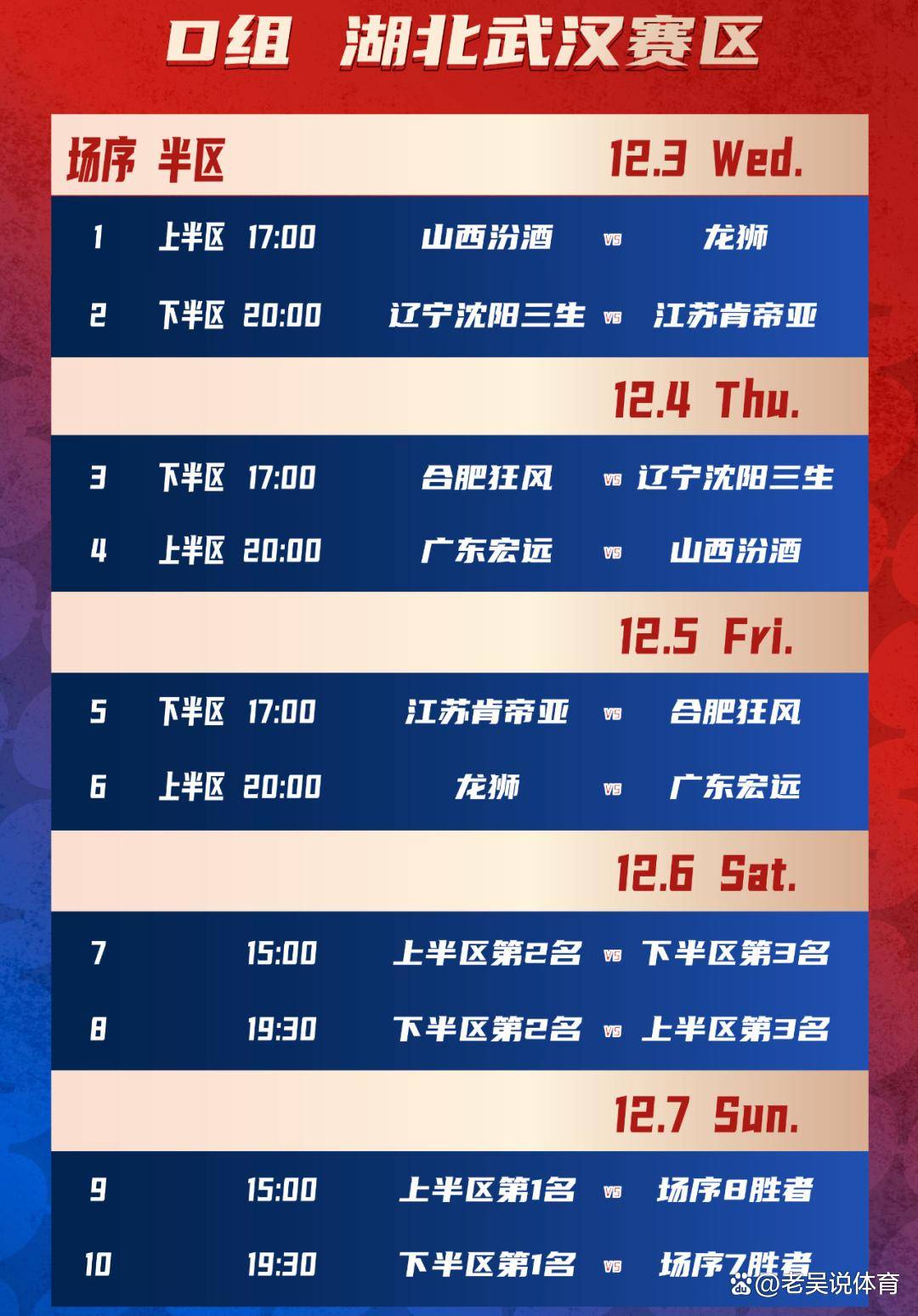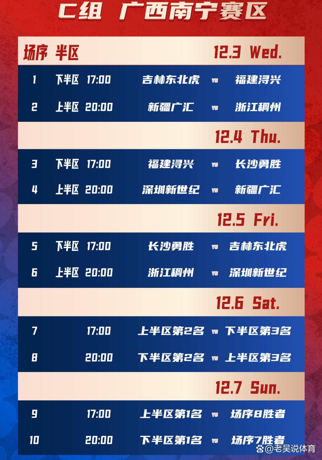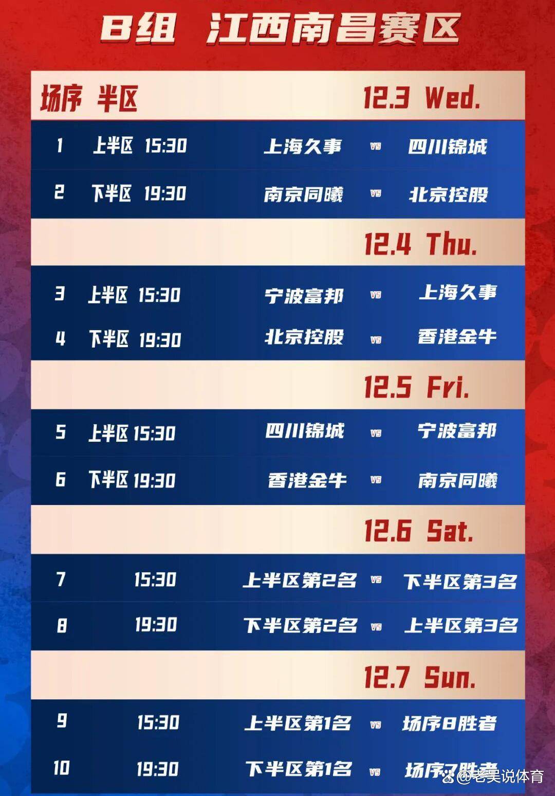 具体赛程已经出炉,各赛区蓄势待发。A组坐落于湖南长沙赛区,小组赛最后一轮的两场焦点战备受瞩目:12月8日,山东高速将与青岛国信海天展开“齐鲁德比”,而浙江广厦将与北京首钢再度交锋,重演上赛季总决赛的巅峰对决。B组落户江西南昌赛区,该组的六支球队整体实力相对平均,上海久事和北京控股或将占据优势。C组在广西南宁赛区开战,新疆广汇和浙江稠州两支强队将于12月3日首个比赛日狭路相逢,为球迷献上一场精彩的揭幕战。D组的比赛将在湖北武汉赛区上演,辽宁男篮将先后迎战江苏肯帝亚和合肥狂风,实力占优的他们有望取得两连胜,锁定小组上半区头名。12月3日,辽宁将对阵江苏肯帝亚,12月4日则与合肥狂风交手。