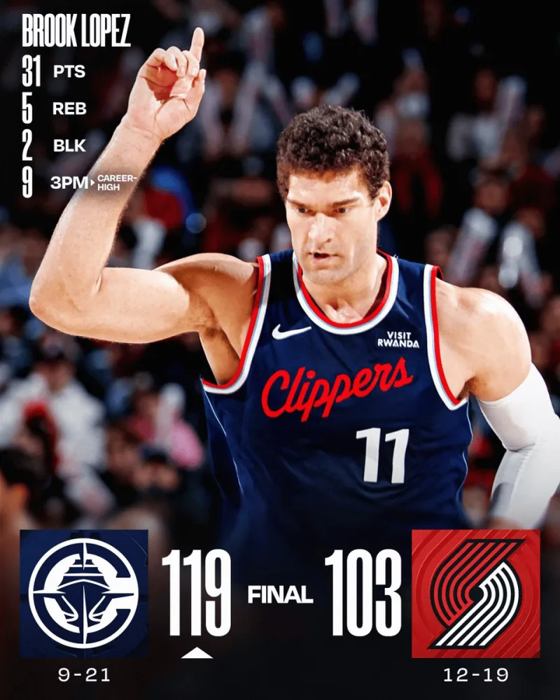 虎扑12月27日讯 今日,据NBA官方账号报道。布鲁克-洛佩斯命中生涯新高的9记三分球,帮助洛杉矶快船队取得三连胜!