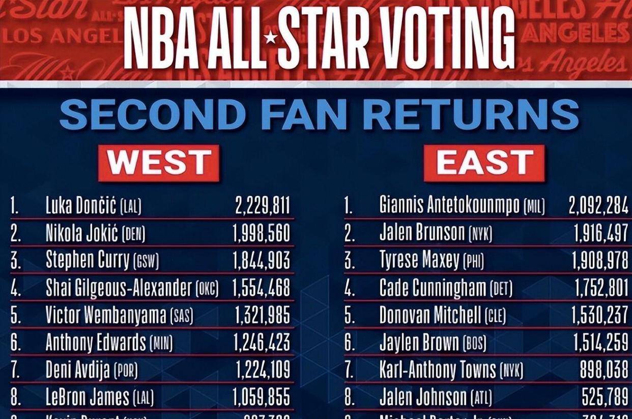 全明星次轮投票结果刚刚出炉,格局已然清晰,但背后的故事比排名更精彩。 卢卡·东契奇以2,229,811票蝉联票王,扬尼斯·阿德托昆博以2,092,284票紧随其后,这两位国际球星霸榜,似乎预示着一个新时代的来临。