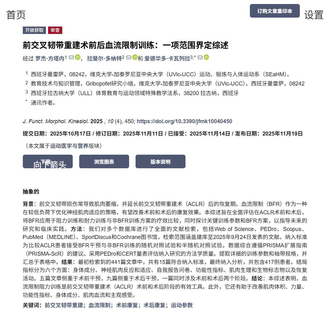 核心结论:血流限制训练在ACL术前预康复与术后康复均有效,尤其术后6–12周大负荷禁忌阶段,可显著提升肌肉量、力量与功能。