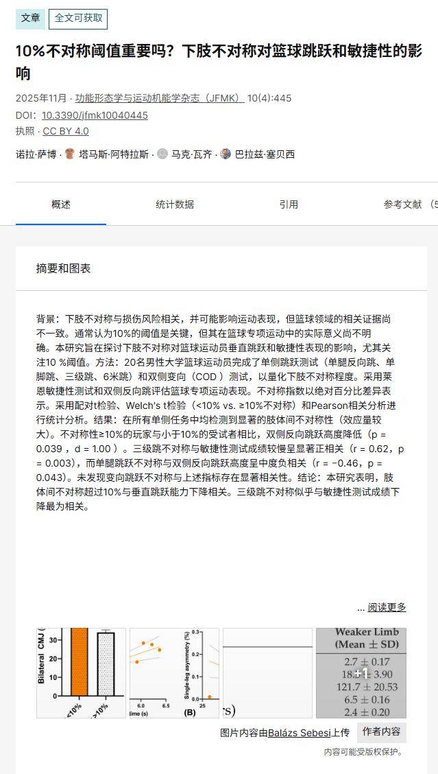 关键结果:不对称≥10%时纵跳显著下降(p=0.039,效应量1.00);三跳不对称与灵敏相关系数r=0.62。
