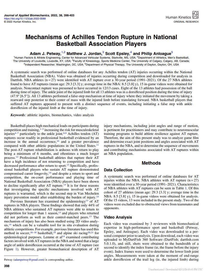 核心结论:NBA跟腱断裂多为蹬地、变向、落地时的非接触性损伤;生物力学特征为膝关节伸展+踝关节背屈,跟腱处于负荷峰值。
