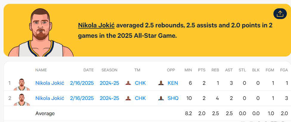 他的这些言论在舆论中引起轩然。此前不少声音质疑约基奇在全明星比赛中缺乏竞争欲望,甚至认为他在常规赛中的投入也并非全力以赴。著名数据媒体StatMuse发布的统计显示,过去两年约基奇在全明星的表现确实平平:今年他出场5分钟,投篮1中0,仅得0分;去年两场比赛合计16分钟,4中2,仅得4分5篮板5助攻,场均数据只有2分、2.5篮板和2.5助攻。总体来说,两年合计21分钟,5中2,得到4分。