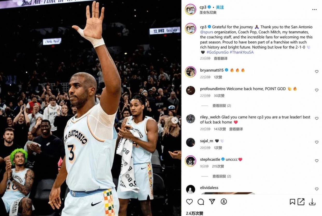 或者火箭——那时和哈登合作,两人带队打出了75胜,闯入西部决赛。再或者太阳,2021年直接闯进总决赛,差个冠军很近。可他在退役前的直播中,手里拿着马刺送的一块定制牌,上面写着这是我效力过的最好的组织。
