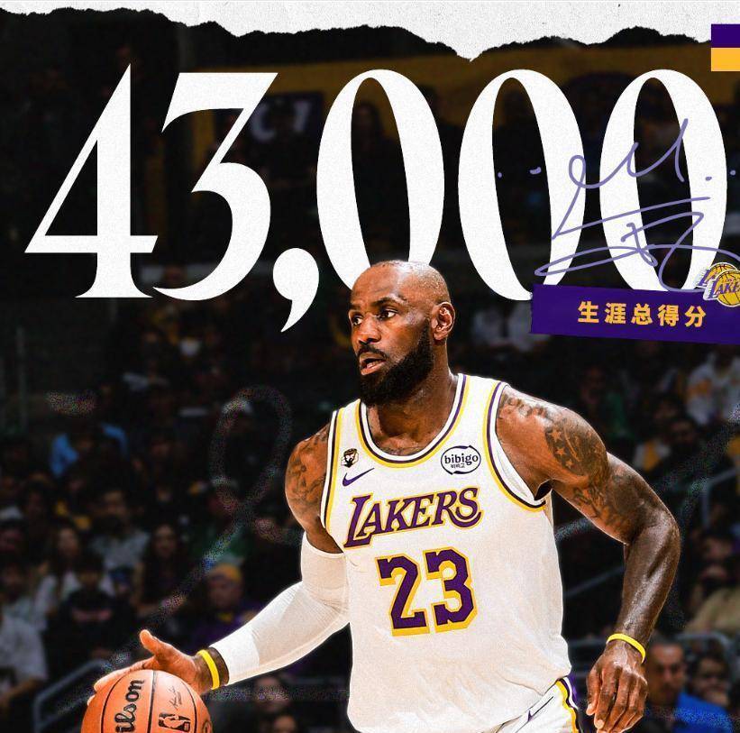正是这看似普通的20分,让詹姆斯跨越了一个前所未有的里程碑。 在本场比赛之前,他的职业生涯常规赛总得分已经达到了42988分。 随着这场比赛得分入账,他的总得分正式突破了43000分大关。 他成为了NBA自1946年成立以来,整整80年历史中,第一位达到43000分的球员。 湖人队官方在比赛进行中,就迫不及待地发文祝贺:“国王的第43000分。 ”